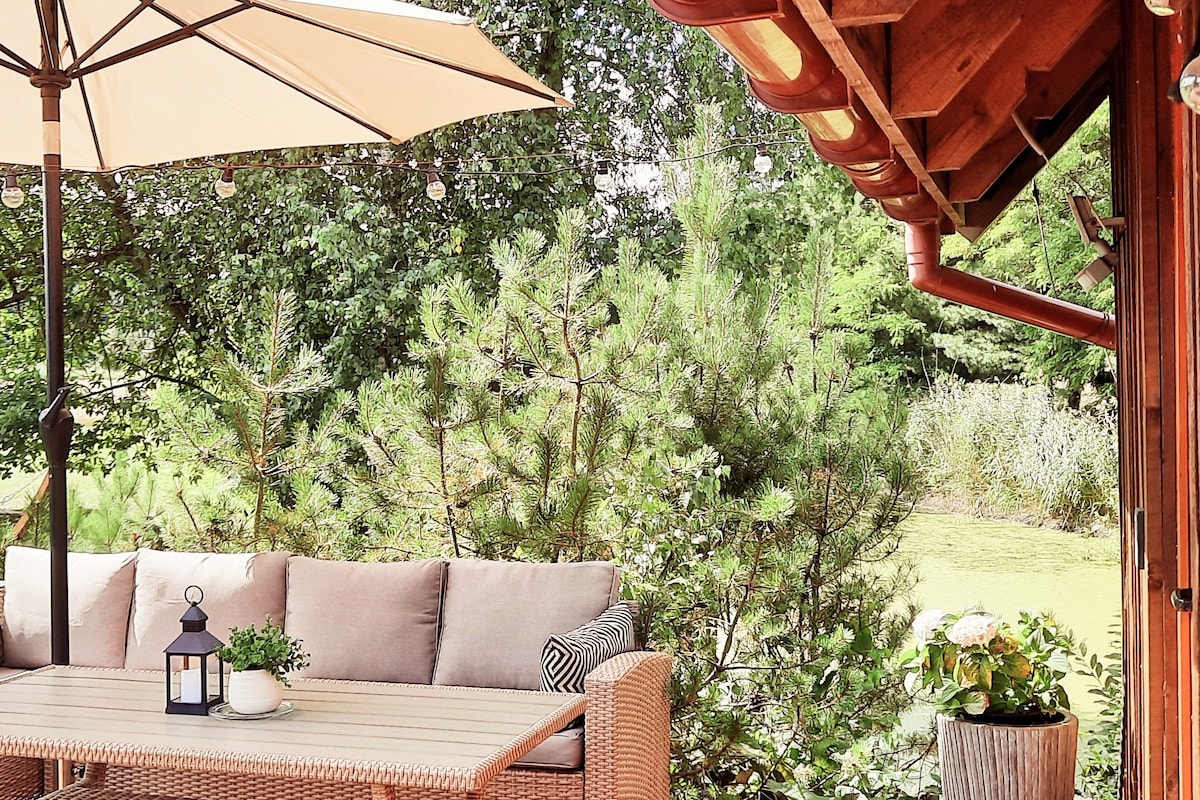 Neliels namiņš ar skatu uz dīķi