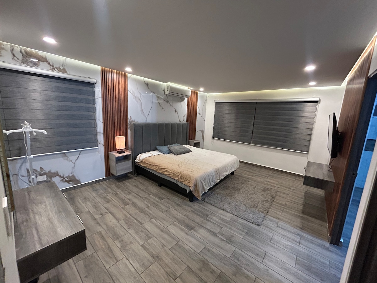 *Mēs veicam papildu higiēnas pasākumus visās savās telpās, lai gūtu sirdsmieru. Aprīkota istaba pirmajā stāvā, ļoti jauka moderna apdare ar virtuves bāru, pilnu vannasistabu, segtu garāžu un automātiskajiem vārtiem, tajā ir gaisa kondicionētājs un apkure, TV, Netflix, WiFi, kas atrodas Cumbres 5o. sektors, atrodas viena kvartāla attālumā no Paseo de los Leones, sabiedriskais transports viena kvartāla attālumā, netālu no Walmart un Plaza Cumbres, lieliska iespēja ilgtermiņa rezervācijām.