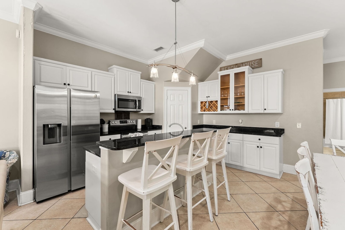 Iespaidīga māja ar 3 guļamistabām un 5 vannas istabām, privātu baseinu! 50 jardu attālumā no baltākajām pludmalēm Meksikas līcī. 1. stāvā ir plaša dzīvojamā istaba, ēdamgalds ar 8 personām un pilnībā aprīkota virtuve. 2. stāvā ir vēl viena dzīvojamā istaba, bārs ar izlietni + ½ vannas istabas, iebūvētas divstāvu gultas un guļamistaba ar "king" izmēra gultu un pilnu vannas istabu. 3. stāvā ir galvenā guļamistaba ar "king" izmēra gultu, privāta galvenā vannas istaba un vēl viena viesu guļamistaba ar divām "queen" izmēra gultām.Jautājiet par abu rindu māju izīrēšanu pagarinātiem ģimenes atvaļinājumiem.