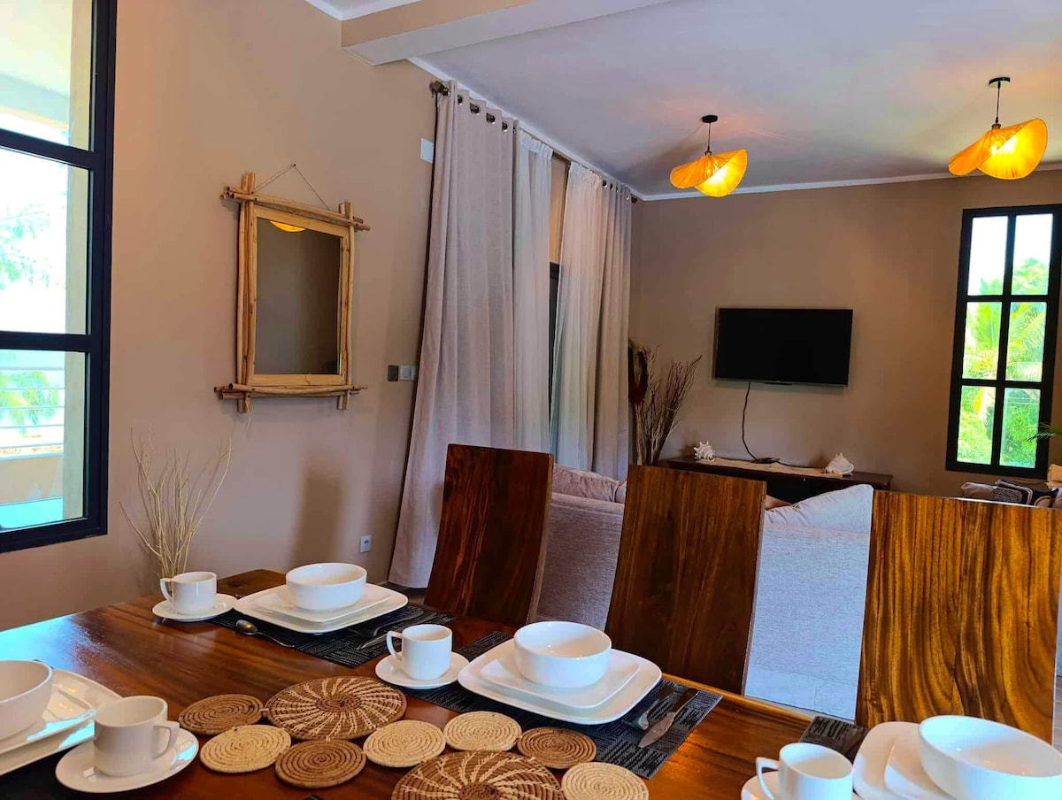 Appartement ayant 1 chambre parentale, et une chambre, pour un total de 2 lits 2 places et 1 lit une place. Comprend l’accès illimité à la piscine, un chalet privé sur la plage, trampoline pour les plus petits, rooftop avec vue sur l’océan, une cuisine équipée, une terrasse vue mer; Starlink à disposition, femme de ménage & cuisinière en option (ménage, lessive, repas sur demande). Grand Parking privé, Gardien sur place. Si vous souhaitez faire du jet ski ou du quad, on peut l’organiser !