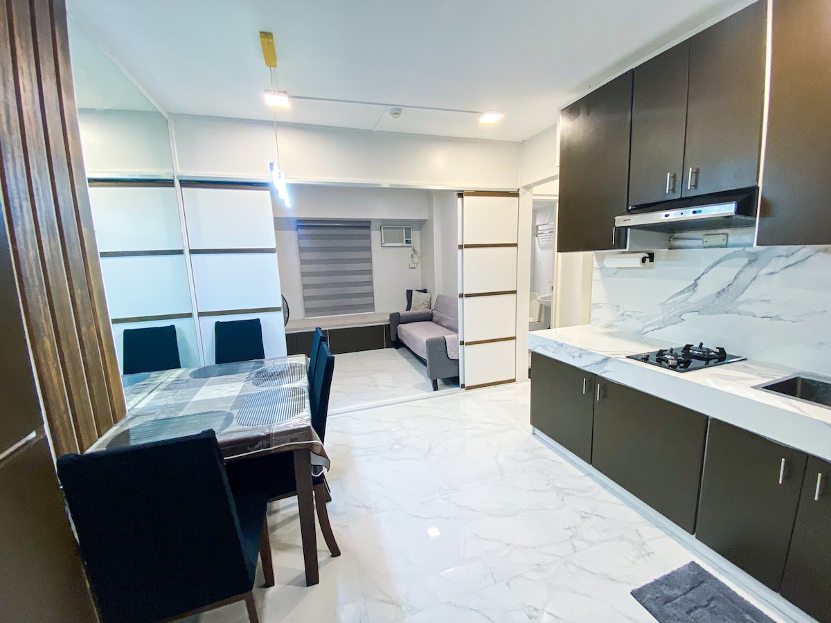 Discover our spacious and bright 1BR end unit with balcony in the newly built Tower 4, Fern Residences. Designed with you in mind, our luxurious boutique-hotel style unit features a fully-equipped kitchen, hotel quality mattress and beddings, convertible coffee to dining table, washing machine and fast WiFi. It is ideal for short and extended stay travellers and for those who just want to have a relaxing staycation.