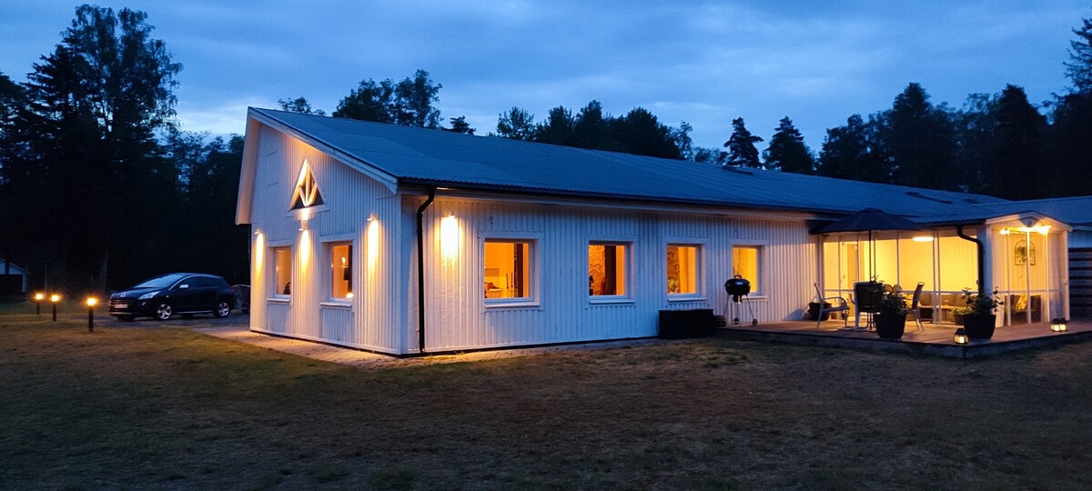 Pavisam nesen (2020.-2021. g.) uzcelta brīvdienu māja, kas atrodas zemes ragā, kur nav redzami kaimiņi. Privāta neliela, seklu krastu pludmale ar laivu un elektromotoru. Kamīns lielajā mājā. Lieliska makšķerēšana ar zandartu, asaru, līdaku u.c. Labs Wi-Fi. Pirts. Sēņošanas un ogošanas vietas. Privāta liela autostāvvieta uz zemes gabala. Aktivitātes tuvumā: Isaberg kalnu kūrorts, High Chaparral, Store Mosse nacionālais parks, Ge-Kås Ullared, Knystaria picērija, Knystaforsen (baltais ceļvedis) Tiraholms Fisk Šeit jūs dzīvojat greznībā, bet tajā pašā laikā ar sajūtu "atpakaļ pie dabas"