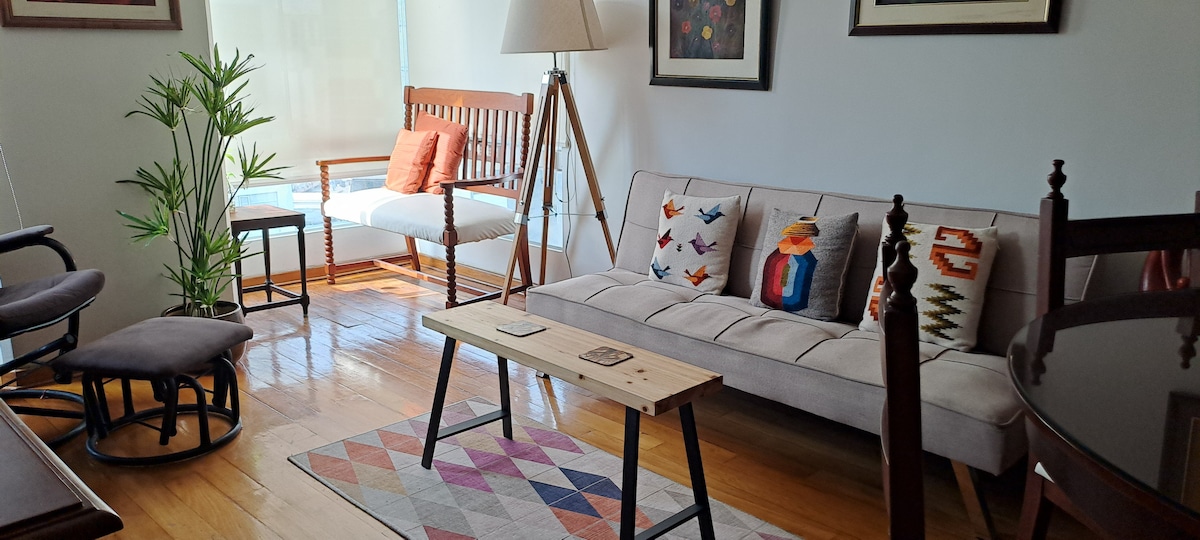 Departamento moderno en el corazón de Miraflores, a pasos del Parque Kennedy Disfruta de una estadía cómoda y segura en este acogedor departamento ubicado en una de las zonas más vibrantes de Lima: Miraflores. A solo 3 minutos caminando del Parque Kennedy, rodeado de cafeterías, restaurantes, bares, supermercados y las principales atracciones turísticas de la ciudad.