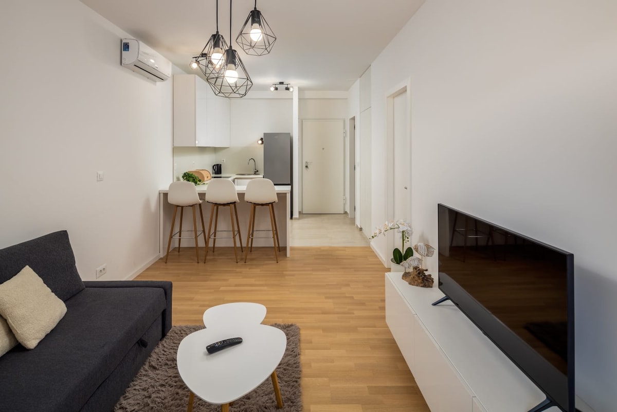 Laipni lūdzam manā jaunuzceltajā dzīvoklī, kas atrodas Splitas daļā ar nosaukumu Sucidar. Tas ir pilnībā aprīkots ar visu, kas jums varētu būt nepieciešams jūsu atvaļinājumā. Tas atrodas tikai minūtes gājiena attālumā no autobusa pieturas (Nr. 9), kas ved uz centru, vai arī varat doties aptuveni 25 minūšu gājienā un izbaudīt manas pilsētas iepazīšanu (2 km/1,2 jūdzes). No jums paveras elpu aizraujošs panorāmas skats uz jūru un kalniem. Šis dzīvoklis ar modernu mēbelēm, gaisa kondicionētāju un bezmaksas Wi-Fi un kabeļtelevīziju piepildīs jūsu uzturēšanos. Iekšpusē ir droša autostāvvieta!