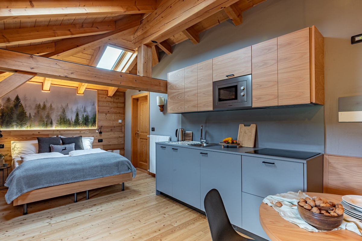 This accommodation is part of a traditional "maso", the old Alpine farmhouse, which has just been renovated. Positioned on the middle floor, it reveals a panorama of serene woods, two tranquil mountain lakes, and the majestic Brenta Dolomites. Inside, the charm of oak wood, the enveloping warmth emitted by the wood stove, and subtle decorations complete the welcoming atmosphere of a modern mountain retreat.