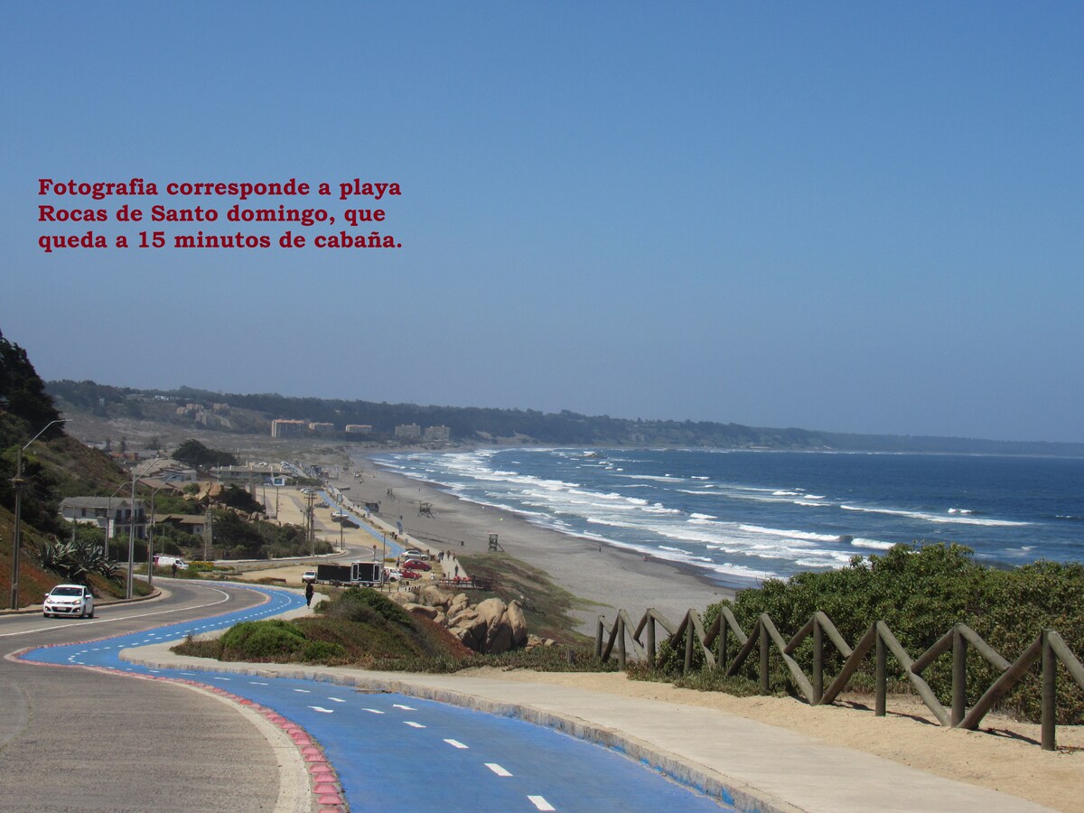 Mi espacio es una cabaña RUSTICA y con detalles sin terminar, sin embargo con todo lo necesario para alojarse, con iluminación natural ideal para descansar escuchar el silencio y conectar con la tranquilidad, esta rodeado de naturaleza, eucaliptos, pájaros y algunos conejos etc. a 15 minutos en auto de playa Rocas de Santo domingo a 25 minutos de parque Tricao y del resto del litoral central. DISPONIBLE SOLO PARA PERSONAS QUE GUSTEN DEL CAMPO ;-)