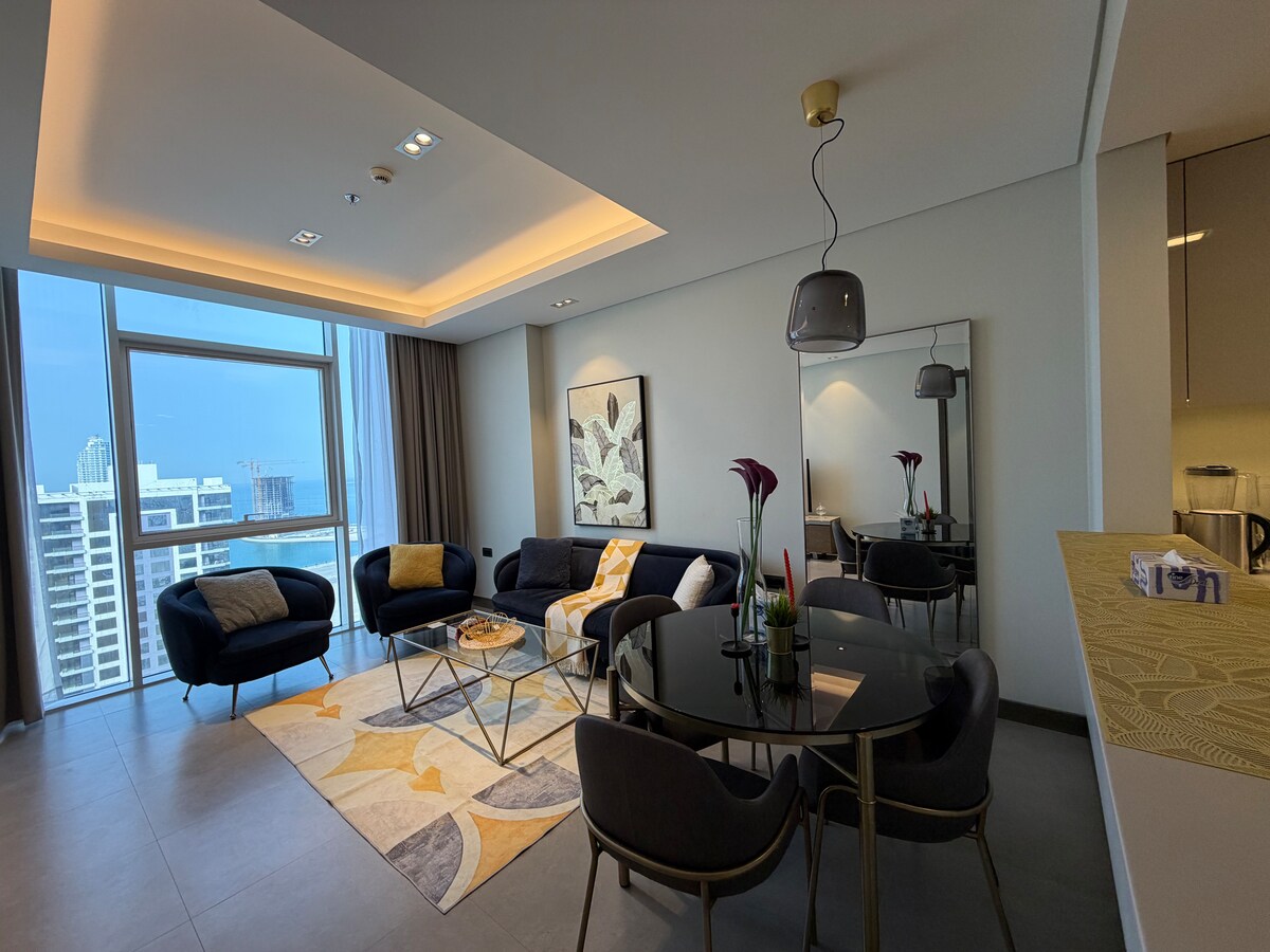 Fully Furnished modern apartment with everything you can think of including washer/dryer, WiFi, fully stocked kitchen and ample parking in front of the apartment building. The apartment is 10 steps away from Lanterns restaurant/bar in Amwaj and 5 min walk to Lagoon, a popular retail and restaurants area in Amwaj Island. Guests have access to private Floating City beach