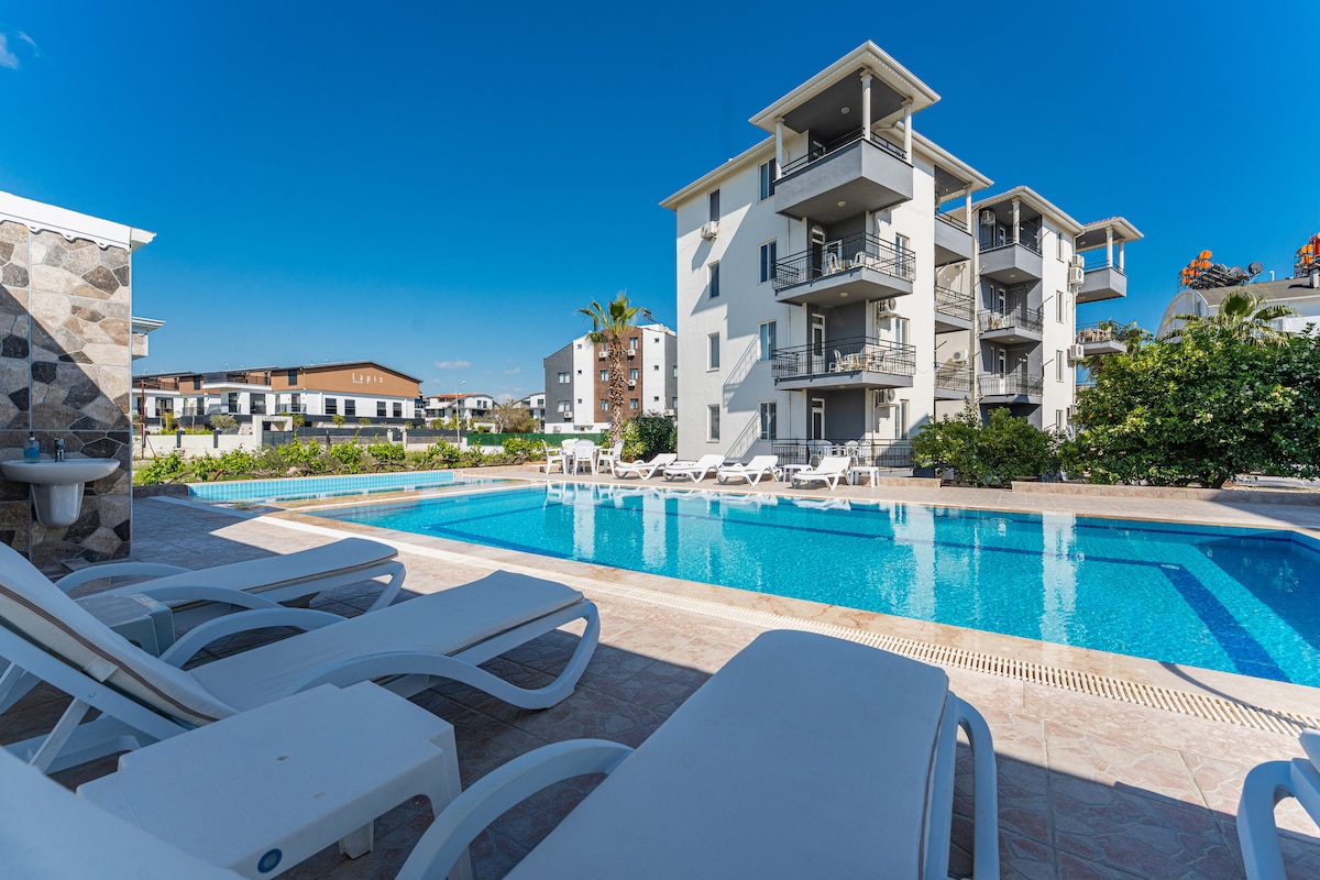 Tā ir stilīga un mierīga ģimenes vieta ikvienam, kurš vēlas baudīt boutique un greznas brīvdienas. Tā atrodas ļoti tuvu Side Antique City, 700 metru attālumā no jūras, 7,5 km attālumā no Manavgatas ūdenskrituma un 65 km attālumā no Antālijas lidostas. Ir pilnībā aprīkota virtuve (visi nepieciešamie priekšmeti, tostarp plīts), Wi-Fi, televizors, ledusskapis, trauku mazgājamā mašīna, veļas mašīna, putekļsūcējs, augstais krēsls un mazuļu gultiņa, gludeklis, fēns un tējas un kafijas automāts. Visi dzīvokļi ir pavisam jauni