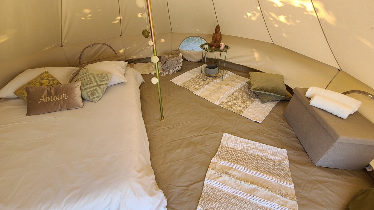 Cena ir balstīta uz diviem cilvēkiem, kas dala telti. Ņemiet vērā, ka no visiem papildu viesiem, kas vecāki par pieciem, tiks iekasēta maksa 10 € apmērā par nakti par personu. Lūdzu, pajautājiet, vai vēlaties līdzās novietot nelielu. Mūsu lielā zvanu telts atrodas mūsu skaistās apģērba izvēles vietā. Mēs nodrošinām divguļamo gultu un gultasveļu, kā arī sēdvietas. Atsevišķs pārsegs nodrošinās ēdiena gatavošanas un ēdamistabas zonu. Atklājiet krāšņo ainavu, kas ieskauj šo mājokli.