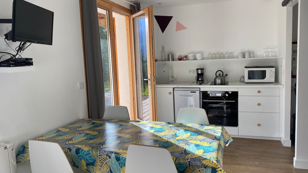 Logement entier de 50m2 situé dans un endroit calme et ensoleillé avec vue sur les montagnes Garage commun pour déposer vos skis. Possibilité d'avoir un local à vélo sécurisé. Meublé et équipé , machine à laver 1 lit et chaise bébé. en rez de jardin avec parking devant l'appartement. A 1,3 km du centre Thônes et tous ses commerces . Piscine, parc aventure . A12 kms des stations de skis de la Clusaz ,Le grand-Bornand, Manigod. Navettes . Seulement à 20 minutes du Lac d'Annecy et ses plages.