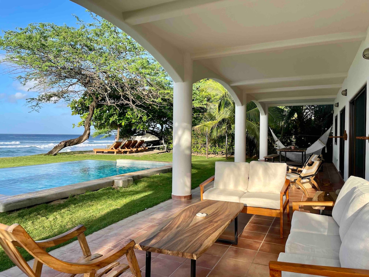 Villa Palmera is beachfront nestled 30 mts above the beach. Direct beach access. Watch from front chairs the waves and sandy idyllic bay and enjoy most amazing views and sunsets,. Perfect holiday base for unforgetable memories for families and friends with many things to do . Solid fiber optic wifi everywhere. Smart TV. 24/7 security. This villa shares the 13 m infinity pool with another villa. Beds can be single or king size. Inside Villas Playa Maderas - just a turn of the costal highway.