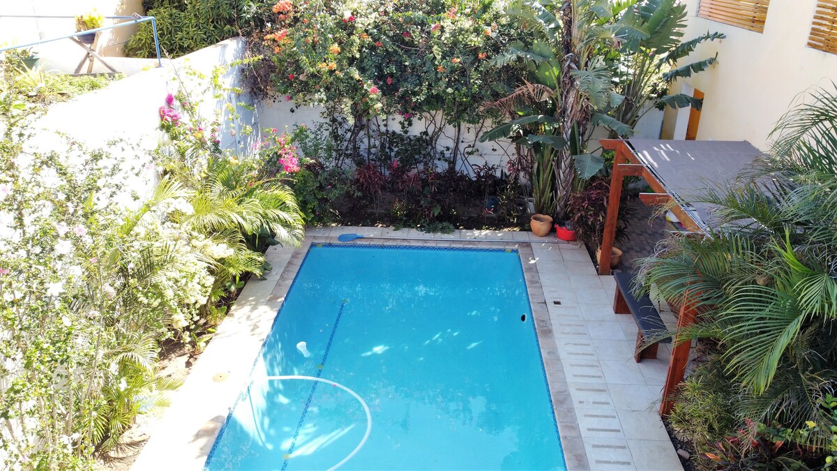 The apartment come with a pool, thatch-roofed patio, garden, spacious self-catering kitchen and an outdoor bathroom. Right in the heart of the very secure, serene and mostly expat community neighborhood of Triunfo in Maputo. This facility offers perfect security, ample space, relaxation and peace of mind. While the whole space and facility is yours to enjoy, please note that the garden may be shared with other guests/occupants of the adjacent building, including maintenance workers.