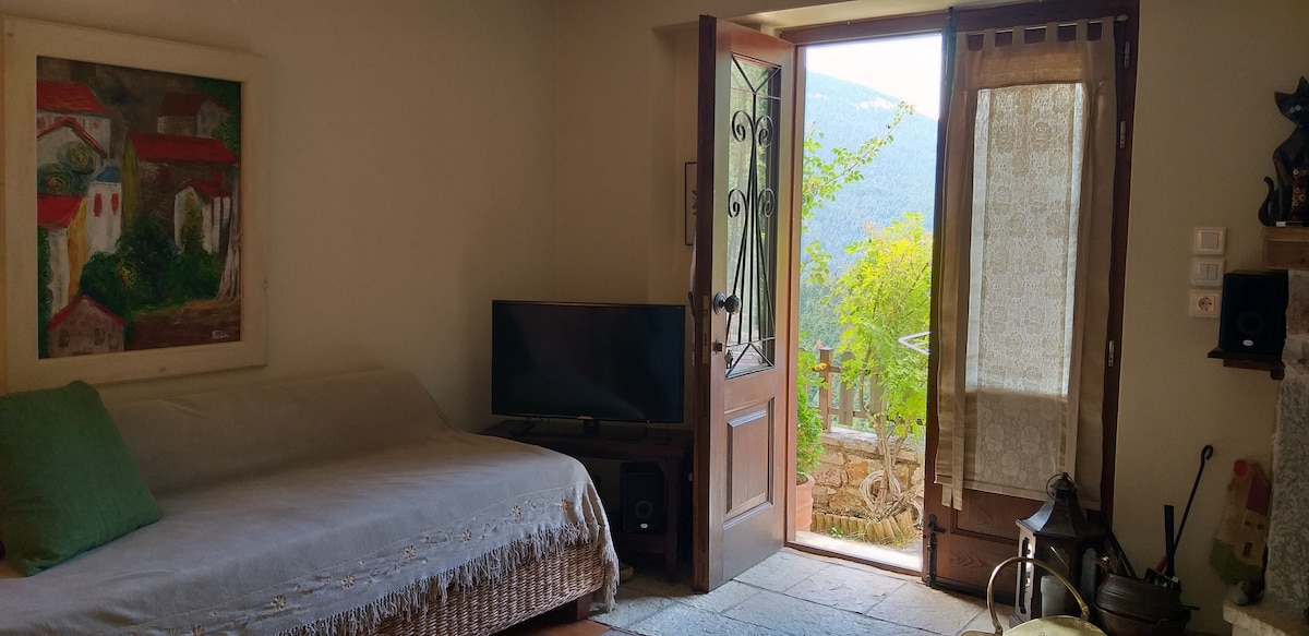 Welcome to La maison particulière Evritania — a renovated stone cellar nestled in the heart of nature. With a cozy height of 2 meters, earth-toned decor, this hideaway offers warmth and serenity Enjoy views of the fir mountains from your terrace and unwind in the outdoor lounge with built-in stone sofas and a wood-burning stove — perfect for romantic evenings under the stars. Located in Evrytania, at 780 meters altitude and near a peaceful stream this space invites you to reconnect with nature