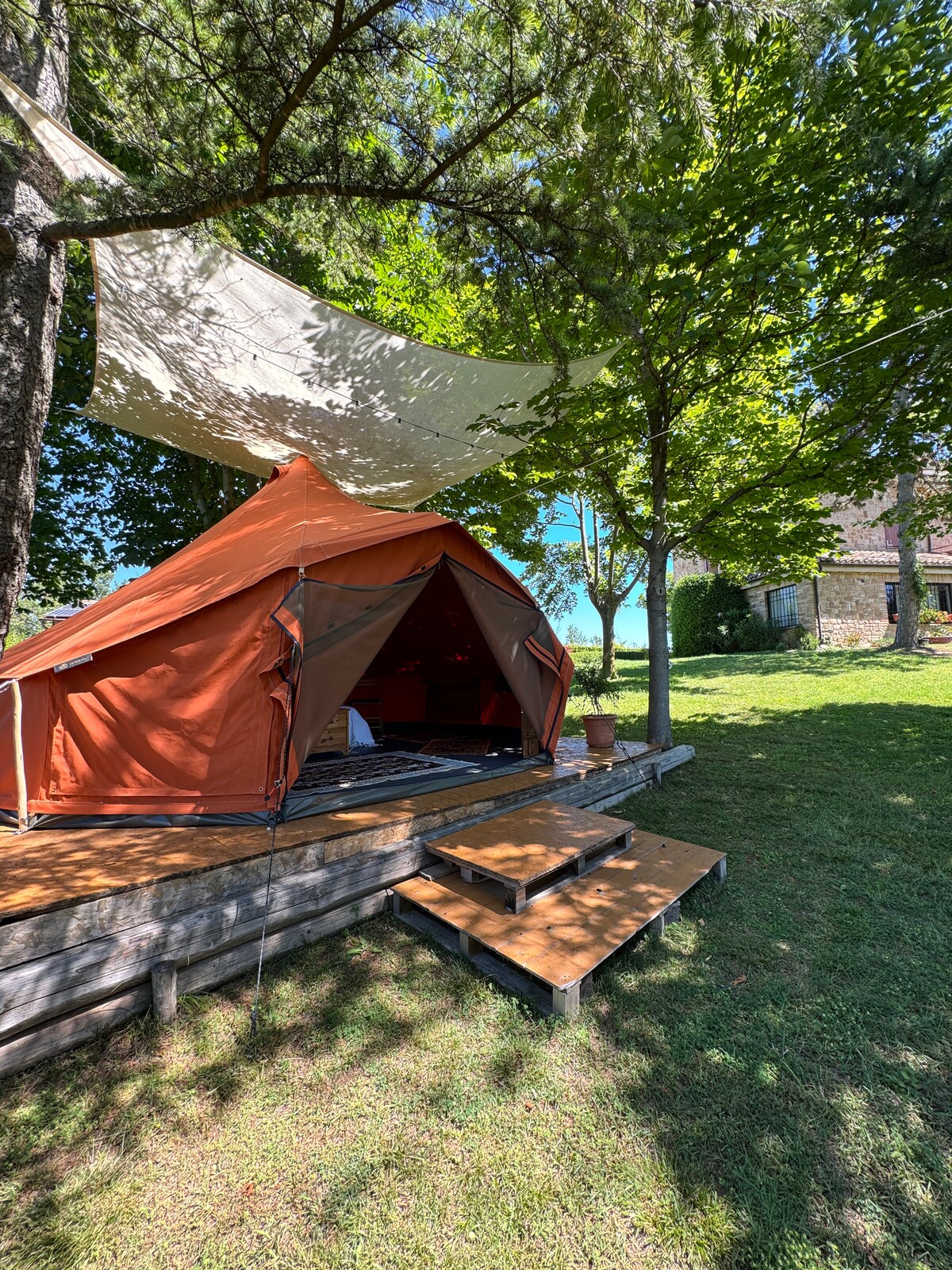 Houd je van kamperen, maar dan wel in stijl en zonder het gesleep met spullen? We hebben twee ingerichte 2-persoons bell tenten op ons landgoed. De ene tent staat midden in de olijfgaard, met veel privacy en een adembenemend uitzicht. De tweede tent staat wat dichter bij de andere gasten. In onze woonboerderij bevinden zich een gemeenschappelijke koelkast, de sanitaire voorzieningen en douches.