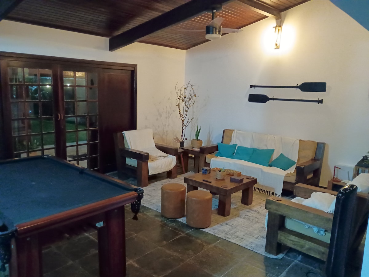 Casa mobiliada 12-15 hóspedes com piscina de 45m2 com ozônio. Amplo espaço externo arborizado, churrasqueira grande, bar molhado, fonte, estátua do Cristo Redentor, bancos com carregadores para celular, mesas e bancos decorativos, móveis jardim, wi-fi, mesa de bilhar/ sinuca, mesa totó, jogos tabuleiros, livros, jogos, ... 3 quartos a/c, 3 banheiros INT (+1 banh EXT+ 2 lavabos) cozinha,sala de estar, sala de jantar e varandão. *em breve SPAR, fogão a lenha, fogueira, piscina infantil, play