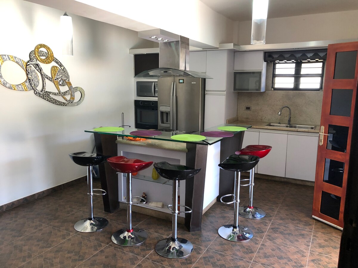 Crea recuerdos inolvidables en este alojamiento único ideal para familias. Pensado para 10 personas. Disponemos de amplia cocina, totalmente equipada y con unas vistas espectaculares. Tres baños, dos en las habitaciones y uno en la planta baja. 5 camas de 140 2 camas de 100 1 cama 200 Tanque de agua. Cocina de gas y eléctrica! Dispensador de agua potable. Congelador. 🌸para acceder a las piscinas debe pagar un brazalete 2$ BCV. 🌸 Estamos preparados para recibirte! Solo faltas tú!
