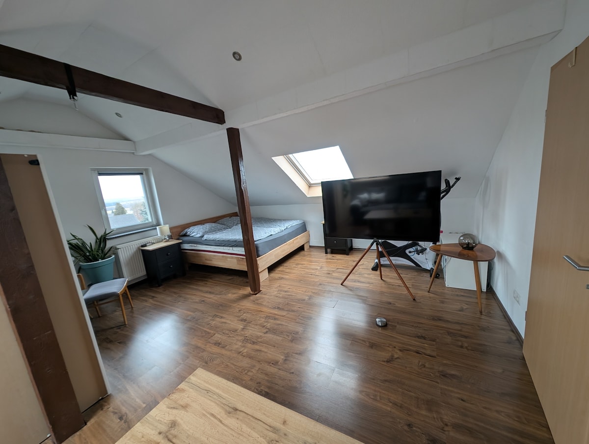 Living in a Gründerzeit house: Unique, cozy & a bit more beautiful! The modern loft apartment is located in a beautiful Gründerzeit house in the Hof city center. Pedestrian zone and train station are each only a few minutes walk away. The loft has a kitchenette, a queen-size bed, an en-suite bathroom with a free-standing bathtub as well as a floor-level shower. The ceiling spotlights can be adjusted in color to create an individually cozy ambiance for bathing.
