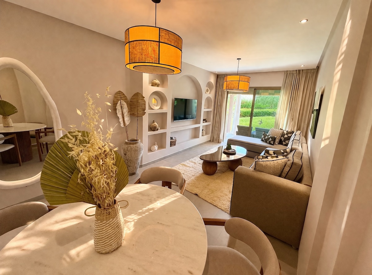 Pievienojieties Marakešas sirdij krāšņajā un mierīgajā golfa kūrortā Prestigia! Atrodoties tikai 5 minūšu brauciena attālumā no lidostas un īsa 7 minūšu brauciena attālumā no pilsētas centra, jūs varēsiet viegli piekļūt visām šī pavisam jaunā 3 guļamistabu dzīvokļa atrakcijām. Jūs izbaudīsiet satriecošus skatus uz golfa laukumu un baseinu. Dzīvesvieta piedāvā lieliskus drošības pasākumus, nodrošinot drošu uzturēšanos restorānā un zaļajās zonās jūsu priekam! Jūsu mājoklis TAGAD