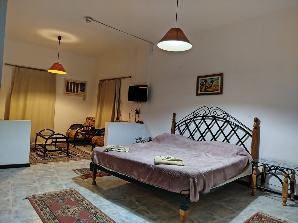 غرفة VIP مميزة مع إطلالة رائعة على حمام السباحة داخل فندق Siwa Safari Paradise. توفر إقامة هادئة ومريحة في قلب سيوة مع تصميم عصري وخدمات مميزة تناسب الأزواج والضيوف الباحثين عن تجربة فريدة.