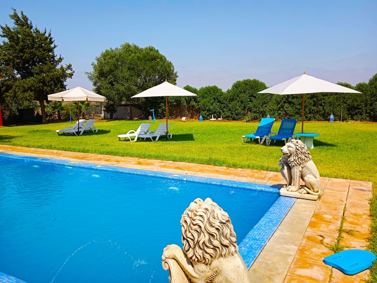 BOUSKOURA GOLFA PILSĒTA Mūsu jaukā klusā villa ir pilna ar modernām ērtībām. Ar divām lielām saulainām terasēm un fantastisku terasi. Tajā ir trīs divguļamās guļamistabas, pilnībā aprīkota amerikāņu virtuve, 2 vannasistabas un dušas telpa., 5 minūšu attālumā no golfa, 15 minūšu attālumā no Mohamed V lidostas, 20 minūšu attālumā no pilsētas centra un 20 minūšu attālumā no pludmales, tuvumā esošais mežs. BALLĪTES IR AIZLIEGTAS. *Mājdzīvnieki nav atļauti