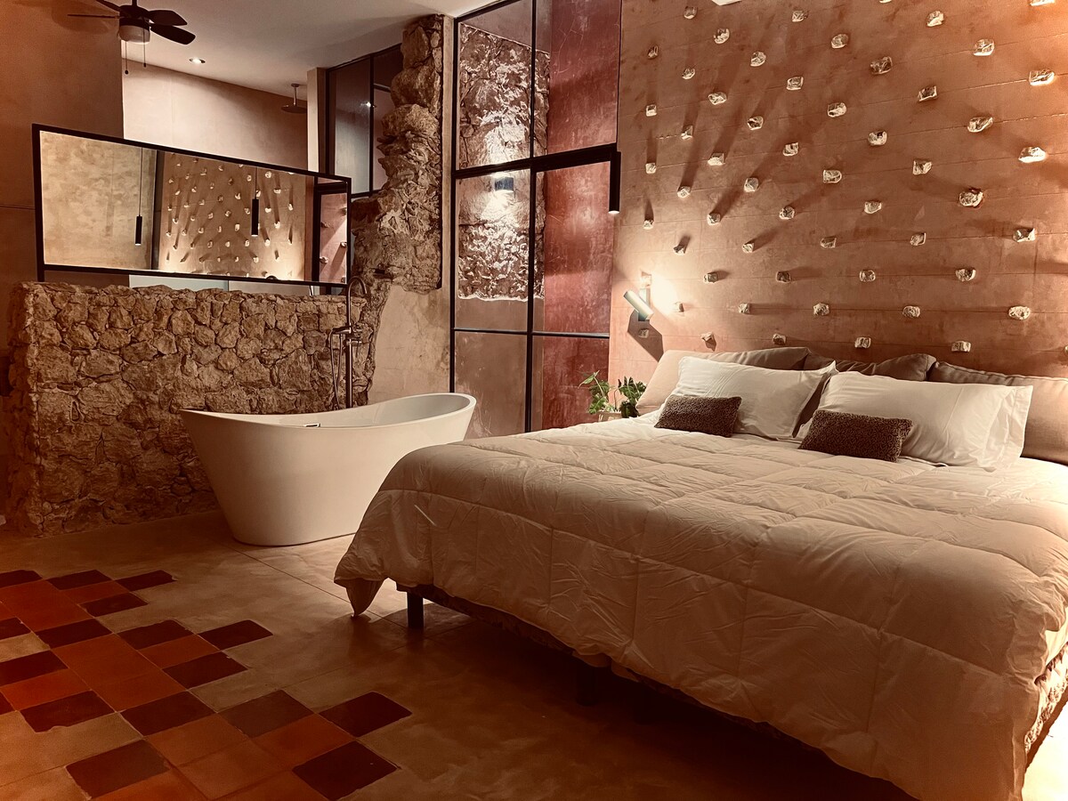 Laipni lūdzam Näab - miera un elegances ostā pašā Meridas sirdī, Jukatanā, kur meksikāņu viesmīlība apvienojas ar holistiskās labklājības būtību. Izbaudiet mūsu iespējas, tostarp spa, holistisku centru un jumtu, kas ir ideāli piemērots, lai atpūstos svaigā gaisā, skatītos uz zvaigžņotām debesīm vai apbrīnotu Yucatec saulrietu." Numurā ir divguļamā gulta, vienguļamā dīvāngulta, mini bārs, televizors, gaisa kondicionētājs.