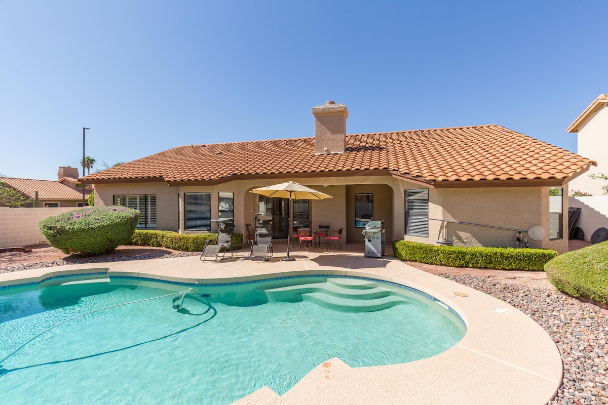 Redziet saullēktu un dodieties uz La Donna Lane! Izbaudiet gaišo un gaisīgo, nesen atjaunināto 4 guļamistabu, 2 vannasistabu mājokli ar sālsūdens baseinu, milzīgu segtu terasi un baseina galda istabu! Mūsu lielās un viesmīlīgās mājas gaida ģimenes un draugus, lai baudītu AZ sauli! Šī ir ideāla vieta lielai cilvēku grupai, kur satikties un atpūsties. Baseina apsilde (vidēji 83 grādi) pieejama no novembra līdz martam par maksu! Lūdzu, jautājiet! Lūdzu, jautājiet par agrīnu reģistrēšanos un novēlotu izrakstīšanos!