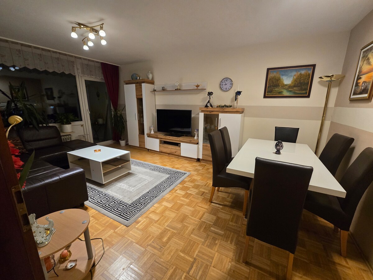 Mēbelēts dzīvoklis, apm. 65 kv.m, divu ģimeņu māja, 1. stāvs. Piemērota virtuve, vannasistaba ar logu un vannu/dušu, viesistaba, guļamistaba ar 180 cm divguļamo gultu 2 personām un dīvāns (140 cm) vienam pieaugušajam vai 1-2 bērniem. Dārza koplietošana, no veļas mazgājamās mašīnas/žāvētāja pagrabā, bezmaksas autostāvvieta , kluss dzīvojamais rajons D-South, savienots sabiedriskais transports: S-Bahn stacija Eller-Süd viegli pieejama ar kājām vai autobusu (līnija 723/732). Izmitināšana pāriem, darījumu ceļotājiem un ģimenēm