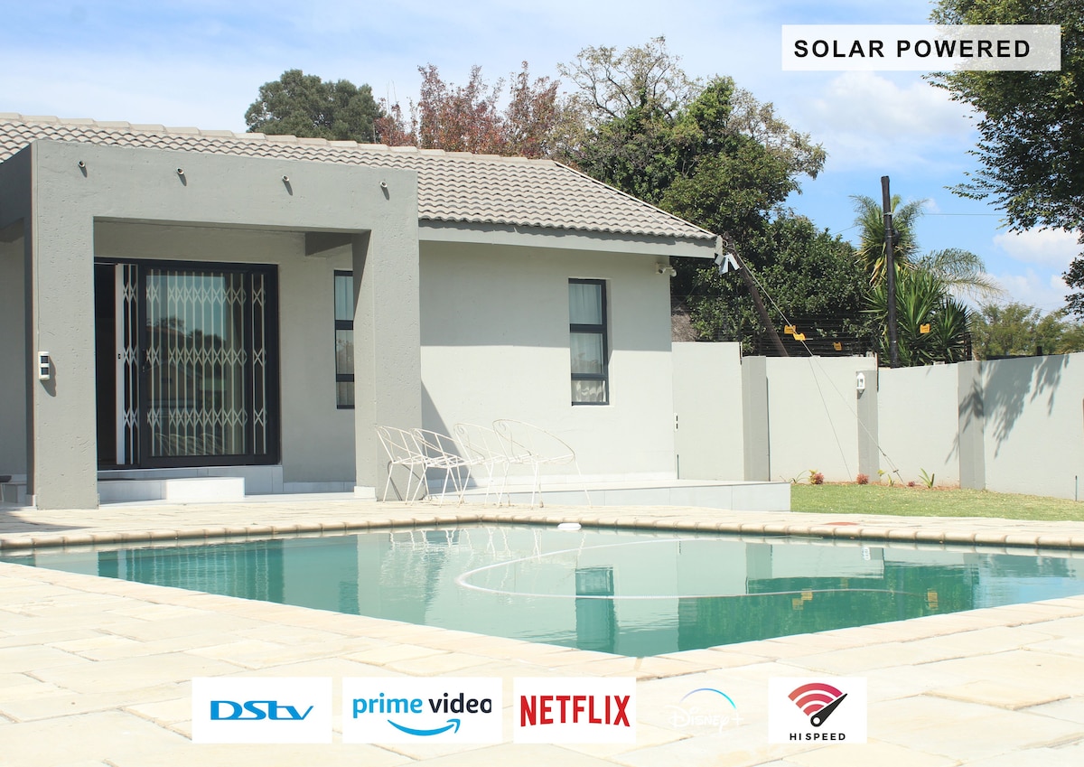 Atrodas Brackenhurst,Alberton. Ieejiet modernā un plašā 40 kv.m pašapkalpošanās vienībā. Virtuve pilnībā aprīkota ar plīti, cepeškrāsni, mikroviļņu krāsni, ledusskapi un veļas mazgājamo mašīnu. Atklāta plānojuma atpūtas telpa ar ērtu dīvānu. Wi-Fi, 32'televizors ar Netflix. Guļamistabā ir 2 vienguļamās gultas un iebūvēti skapji. Vannasistabā ir milzīga pastaiga dušā, baseinā un tualetē. Autostāvvieta atrodas aiz tālvadības vārtiem, un tajā ir pietiekami daudz vietas 2 automašīnām. Atpūtieties ap dzirkstošu peldbaseinu vai malkojiet dzērienu zem lapas.