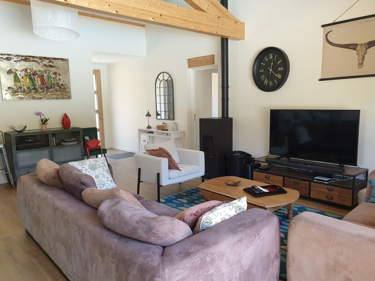 Jauna māja meža ielokā blakus veloceliņam un pludmalēm Landes piekrastē Tā sastāv no viesistabas ar amerikāņu virtuvi, 3 guļamistabām, tostarp 1 galveno apartamentu ar vannasistabu un tualeti , lai pabeigtu vēl vienu vannasistabu un neatkarīgu tualeti. Interneta šķiedra 🛜 Ārpusē no aprīļa līdz 11. novembrim apsildāms pilns dienvidu peldbaseins 4 x 8,5 m platībā ar labiekārtotu dārzu un 110 m2 koka terasi. Moliets un maa pludmale un golfa laukums atrodas 10 minūšu attālumā Vieux Boucau 15mn Hossegor 28mn . Biarica, 50 milj.