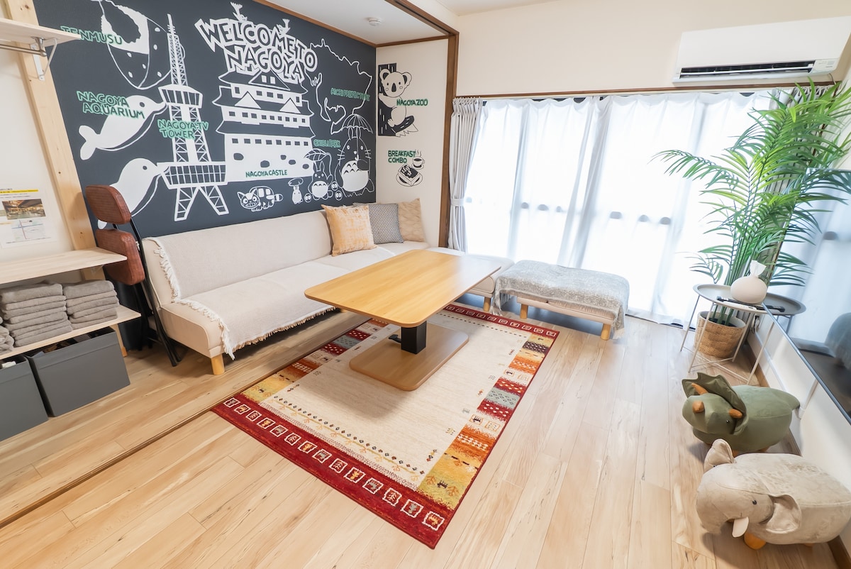 Conveying the philosophy of “living as you live,” this guesthouse is conveniently situated approximately 10 minutes by automobile from Nagoya Castle. It has the capacity to accommodate up to eight individuals. All rooms, encompassing the living room and bedroom, are equipped with air conditioning. Complimentary parking is offered on the premises for a maximum of two vehicles. Additionally, high-speed Wi-Fi and children’s toys are provided without any charge.
