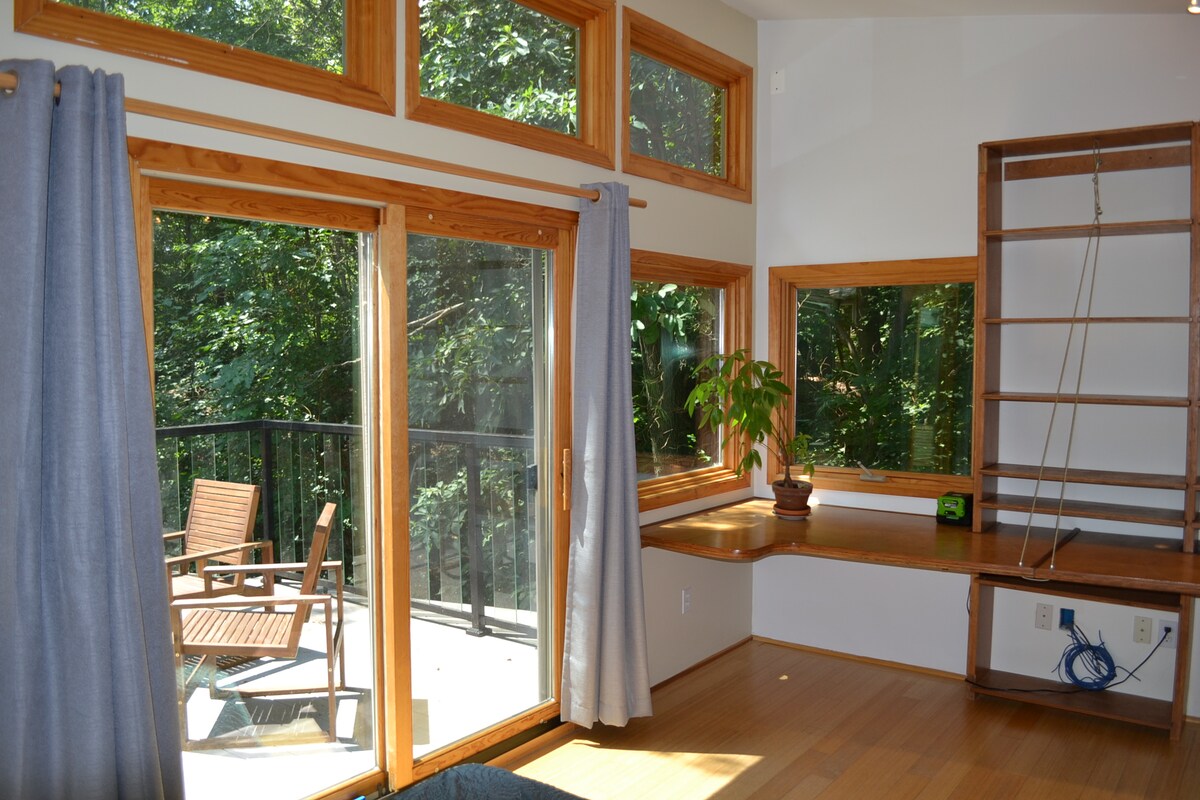 Milzu koki sagaida jūs atpakaļ uz namiņu mežā. Namiņš kopā ar manu māju un nelielu kotedžu atrodas 2,5 akru lielajā īpašumā. Mūsdienīgs tērauda un priedes namiņš ar velvētiem griestiem un debesu gaismām. Atvērta dzīvojamā telpa, aicinoša divguļamā gulta (Queen), luksusa lietus duša, pilna virtuve, bet bez plīts. Malkas kamīns - nokrīt līdz marta beigām un pie ugunskura vietas. Publiska pludmale 5 minūšu brauciena attālumā. Pāri apskata namiņu jubilejās un īpašās dienās.