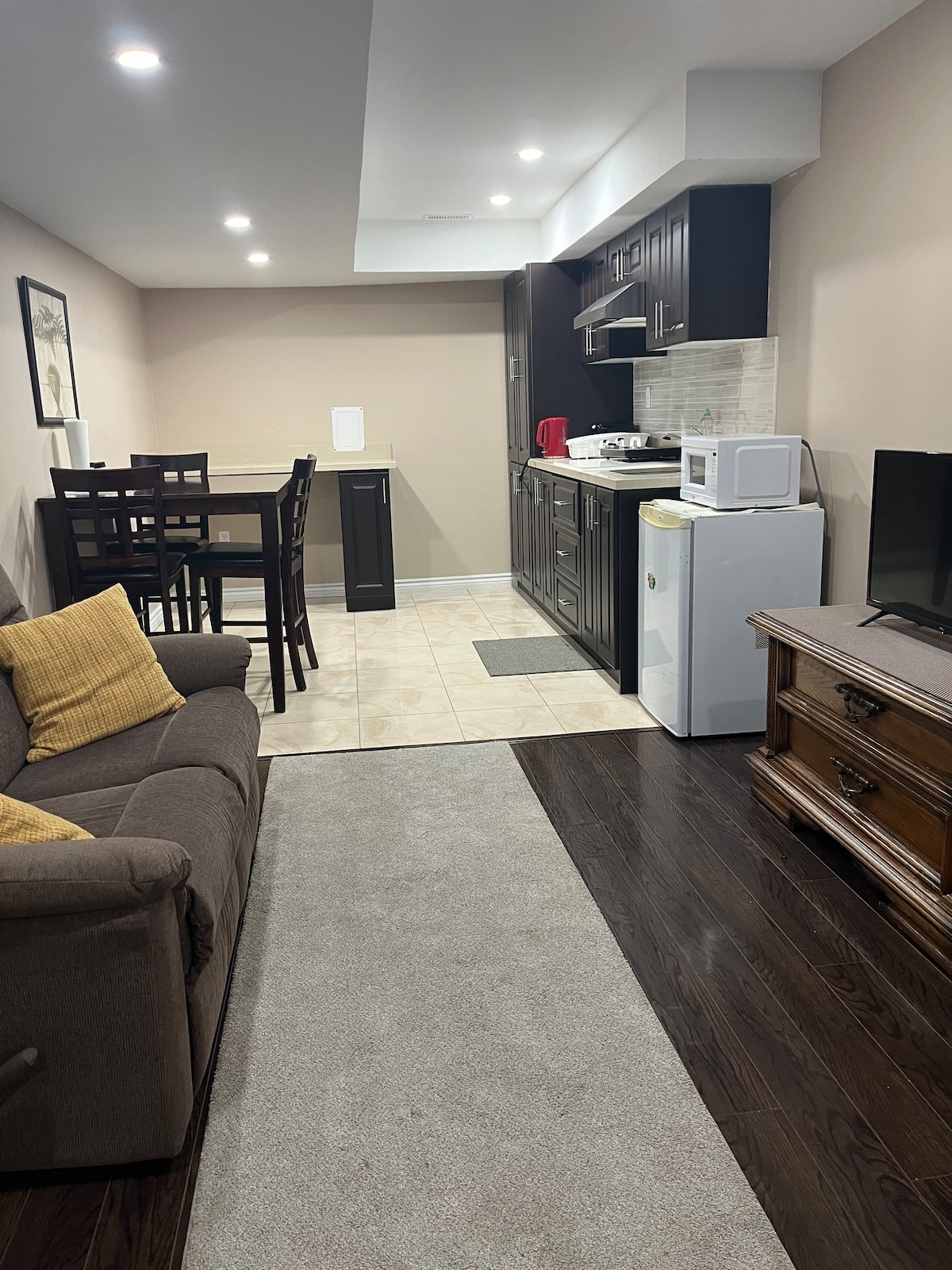 Welcome to New Toronto! Driveway parking included next to entrance. Large -Cozy basement apartment in lakeshore village, Lake Ontario is at the end of the street. Beautiful skyline view of downtown Toronto , Full kitchen with stove and oven. Large dining room table. Comfortable L- shaped couch. One bedroom with queen size bed. Washer , dryer, laundry facility. WiFi Netflix, Prime video, Book a month or longer stays , bring your pet.