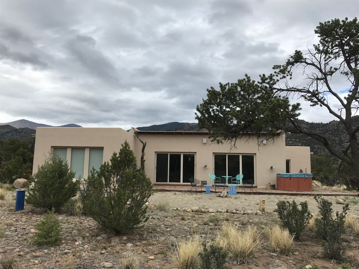 Nāciet atpūsties mūsu skaistajā dienvidrietumu adobes stila mājoklī, no kura paveras neticami skati uz koleģiālajām virsotnēm un ērta, ātra piekļuve Ārkanzasas upei. Mūsu privātais mājoklis atrodas klusā kopienā, kas atrodas BLM zemē un Fourmile Rec apgabalā . Mēs atrodamies 10 minūšu brauciena attālumā no pilsētas un netālu no daudzām brīvdabas aktivitātēm, piemēram, pārgājieniem, riteņbraukšanas, plostiem un makšķerēšanas. Izbaudiet mūsu mājokļa ērto, atvērto dzīves telpu, kur jūs un jūsu draugi varat radīt jaunas un aizraujošas atmiņas! *Pack&Play, bērnu sēdeklītis