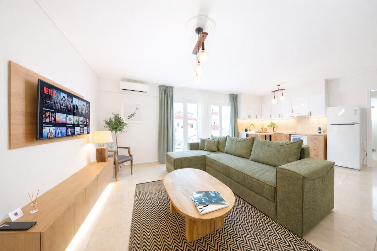 Laipni lūdzam Olive Aura! Šis pilnībā atjaunotais dzīvoklis apvieno augstas klases dizainu ar mūsdienīgu komfortu, un tas atrodas ļoti tuvu Mitilēnes pilsētas centram. Mūsu mājoklis, kura iedvesmas avots ir olīvkoka simbolizētais miers un labsajūta, ir veidots tā, lai piedāvātu mierpilnu un atspirdzinošu uzturēšanos. Interjerā valda nomierinoši toņi un gaišas, plašas telpas, ko papildina divi jauki privāti balkoni. Katra detaļa ir pārdomāta, lai jūs varētu pilnībā atpūsties. Priecāsimies jūs uzņemt!