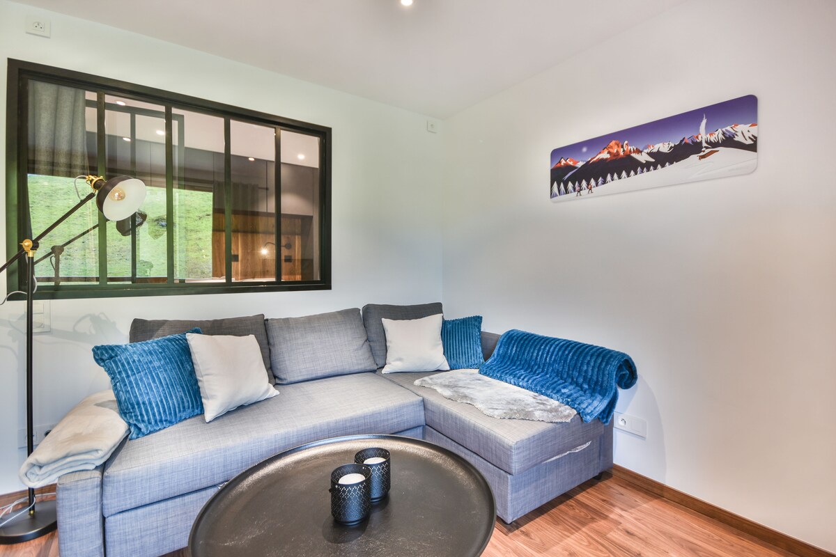 Atstājiet automašīnu autostāvvietā un izbaudiet kūrortu kājām! Atrodas blakus publiskajam SPA centram Carrefour Montagne, slēpošanas trases atrodas 100 m attālumā. Šī 30 m2 lielā, klusā, dienvidu pusē esošā mājiņa piedāvā ieeju/slēpju istabu, nelielu guļamistabu ar 140 x 190 cm gultu, naktsgaldiņu, skapi, virtuvi ar trauku mazgājamo mašīnu, veļas mašīnu ar žāvētāju, kombinēto cepeškrāsni un mikroviļņu krāsni, Nespresso kafijas automātu, viesistabu ar dīvānu, Wi-Fi, viedtelevizoru ar Netflix un Orange, dienvidrietumu balkonu un saklātas gultas.