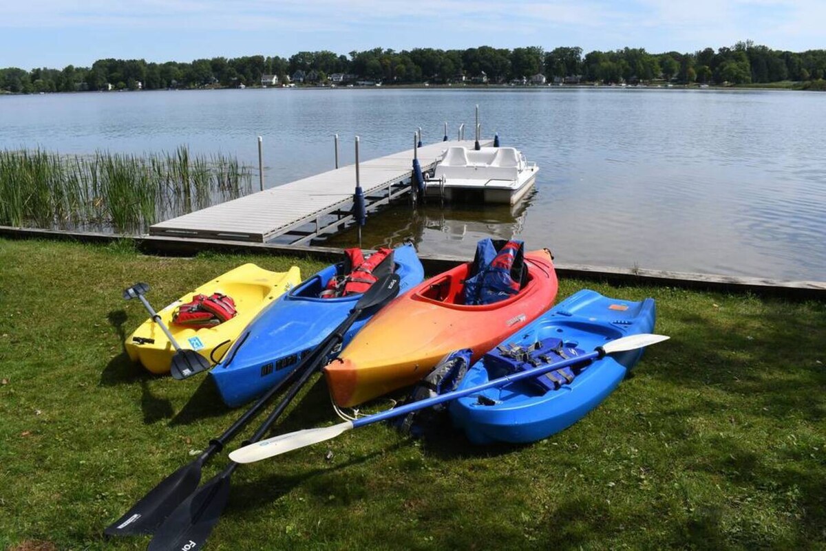 All Seasons Lakefront Cottage Getaway - 7. miegs. Viena pilna vanna un āra duša -Gultas: 1 karaliene, 1 pilna gulta, 2 dvīņi, Q izvelkams dīvāns -120 pēdu privāta ezera piekraste un pastaiga pludmales zonā - Liels pagalms. Klājs ar galdu/krēsliem. Propāna grils. Ugunskura vieta. Kajaki un pedāļu laiva - Mīļdzīvniekiem un kuģiem ir nepieciešams saimnieka apstiprinājums. Ir spēkā mājdzīvnieku nodevas un noteikumi. - Kamera vērsta prom no ieejas durvīm, lai nodrošinātu lielāku drošību un sirdsmieru.