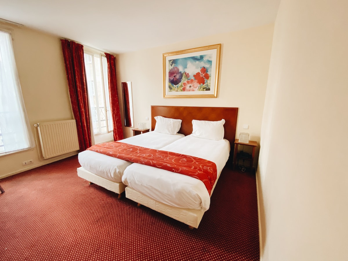 Standard Twin room with private bathroom in the Hotel Palm***, Astotel 3-star boutique hotel ideally located in the heart of the 9th arrondissement of Paris, near Montmartre, Gare de l'Est and Gare du Nord train stations, and public transportation. 24/7 reception. Possibility of free luggage deposit all day on arrival and departure days.