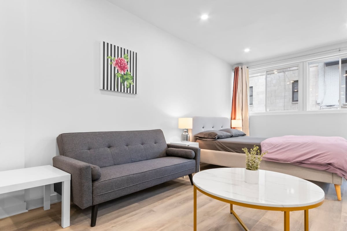 Izbaudiet plakankalnes šarmu šajā gaišajā, stilīgajā loftā! Dabiskā gaisma pārpludina atvērtā koncepta telpu, akcentējot atklātas ķieģeļu sienas, planējošus griestus un modernu dizainu. Izejiet ārā un izbaudiet dinamisku, māksliniecisku apkaimi, kurā ir modernas kafejnīcas, veikaliņi un galerijas. Dodieties uz populārākajiem restorāniem, teātriem, pārtikas veikaliem un tirgiem, metro stacijām, veloceliņiem un Mont Royal - viss, kas nepieciešams autentiskai, neaizmirstamai atpūtai pašā pilsētas sirdī!🚲🍽✨
