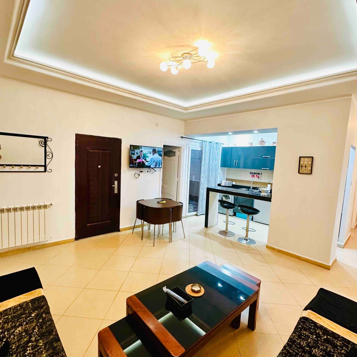 Mēs ar prieku piedāvājam jums jauku, modernu F3 tipa dzīvokli, kas atrodas jaunas villas 2. stāvā Kharrouba, Mostaganemā. sastāv no virtuves, kas atvērta plašai zālei, 02 guļamistabai ,lielai viesistabai un terasei ar skatu uz jūru. aprīkots ar visām ērtībām, piemēram, centrālo apkuri, gaisa kondicionētāju, WiFi, kā arī autostāvvietu garāžā. Pieejama villa; 5 minūšu atrakciju parks, 7 minūšu attālumā no Sidi Mejdoub pludmales un 13 minūšu attālumā no pilsētas centra