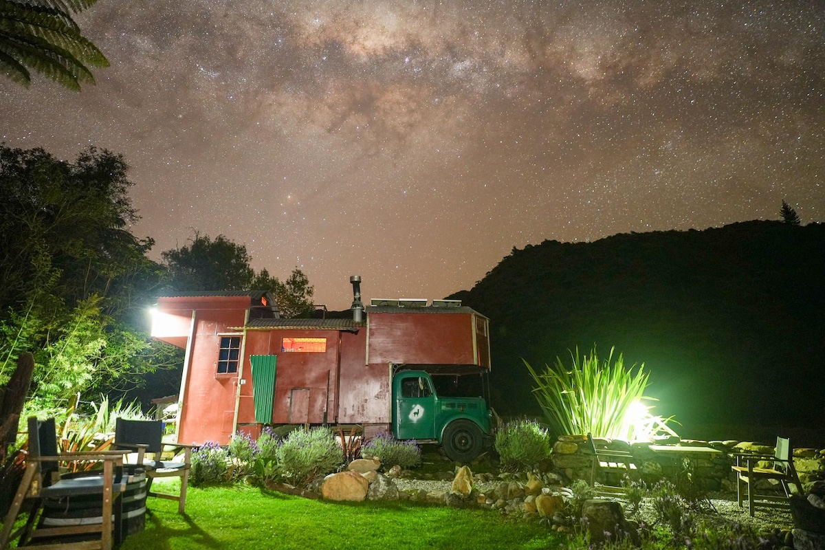 Romantic Getaway. The Caboose is a handcrafted replica of a train carriage, with a small private garden. Set on a half acre property next to our historic farmhouse, centrally located at the outskirts of Motupipi, at the eastern side of Golden Bay, only 5 minutes drive from the beach and 5 minutes from Takaka township. The outdoor shower, bath and toilet are all in the private garden that can be accessed with stairs from the side of the balcony of The Caboose. Full cell phone coverage.