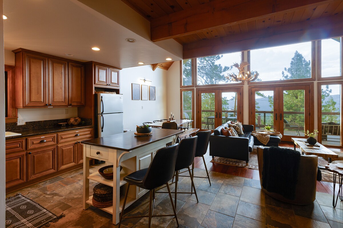 Rancho Pines ir klasisks A-rāmis ar svaigu līdzsvaru starp mūsdienīgu braukšanas maksu un lauku šarmu. Centrāli atrodas tikai 1.2 jūdzes no ciemata un sniega samita slēpošanas kūrorts klusā cul-de-sac ir tieši tas, kur jūs vēlaties būt. Pārbūvēta virtuve, vannasistabas virs dabiskā upes klinšu grīdas. Izejiet ārā uz 280 grādu iesaiņojuma klāja, kur ir grils, atpūtas zonas un privāta burbuļvanna. (Nav mīļdzīvnieku) Drošības apsvērumu dēļ man ir ārējā kamera, kas uzrauga piebraucamo ceļu