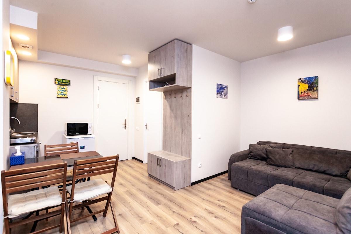 Well decorated and furnished Studio Hotel apartment with spectacular mountain view from both balcony and large king size bed, so you can enjoy the spectacular view from balcony or from the bed, it is located in the 2nd floor of loft 2 building of Redco Complex in Heart of New Gudauri, right next to Gondola Ski lift. The apartment has unique design, stunning mountain view from balcony. The apartment has super great location in the centre for those who like Skiing & other snow and mountain sports.