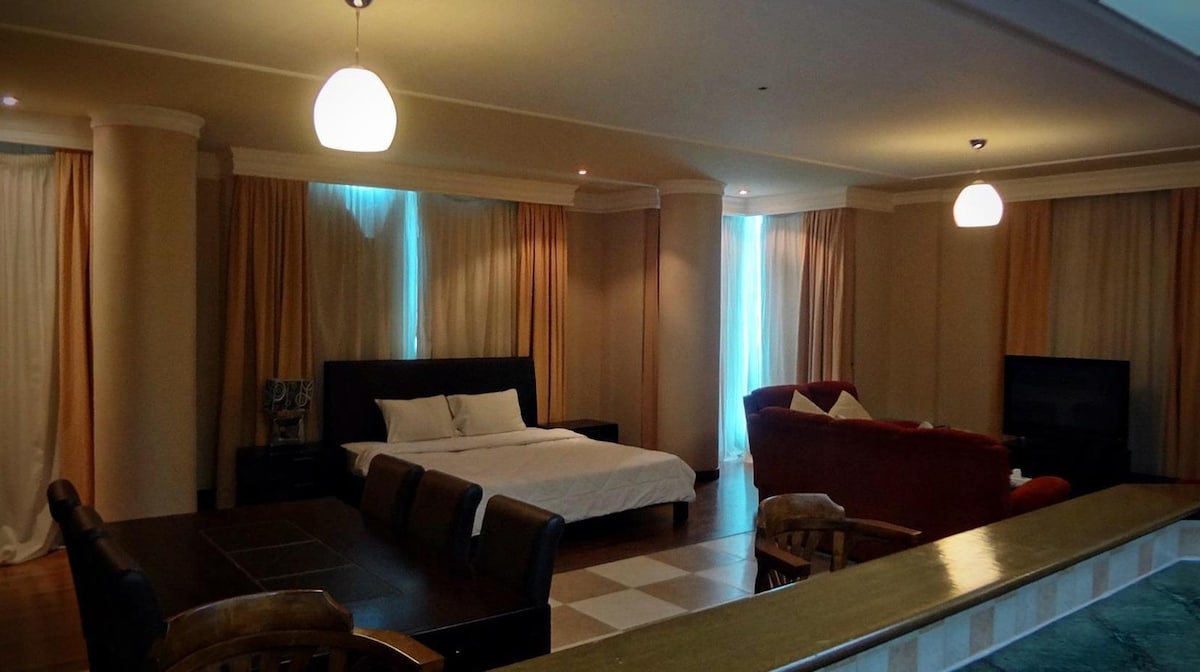 Experience comfort and elegance in this modern one-bedroom apartment, thoughtfully designed for a relaxing stay. Located in a prime area, the apartment features a cozy living room with soft lighting, stylish furniture, and warm colors that create a welcoming atmosphere. The bedroom offers a king-size bed, soft linens, and calming blue curtains for peaceful sleep. Enjoy your meals at the wooden dining table beside the fully equipped kitchenette with all essential appliances