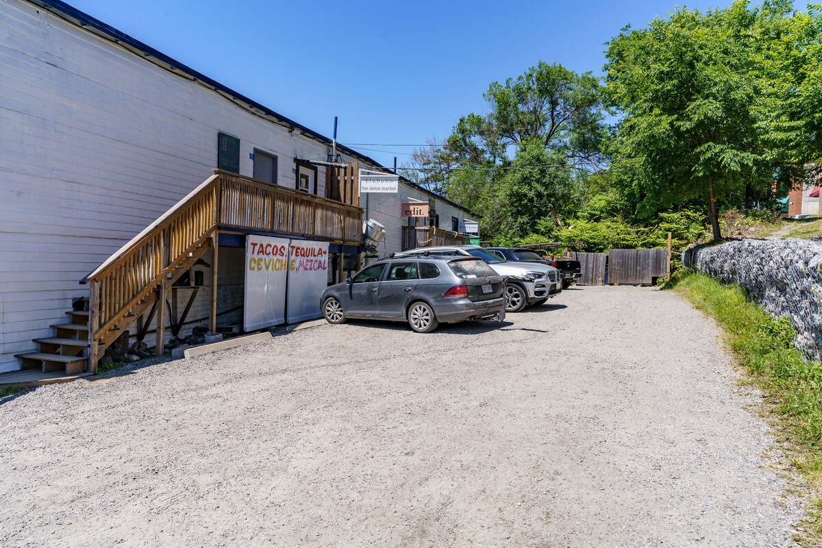 Laipni lūdzam Muskokas upes kalnu namiņā! **Pirms rezervācijas, lūdzu, izlasiet pilnu sludinājuma aprakstu.** Atpūtieties savā pilnībā privātajā vienistabas dzīvoklī ar privātu virtuvi, mājīgu viesistabu, kurā ir viedie televizori un grauzdēti kamīni. Izpētiet mūsu kopīgās ārtelpas 60'krastmalā. Ļaujieties burbuļvannai atpūtai. Tikai dažu minūšu gājiena attālumā no pilsētas, lai iepirktos, baudītu vakariņas un naktsdzīvi. Rezervējiet tūlīt, lai gūtu nevainojamu komforta un ērtību apvienojumu!