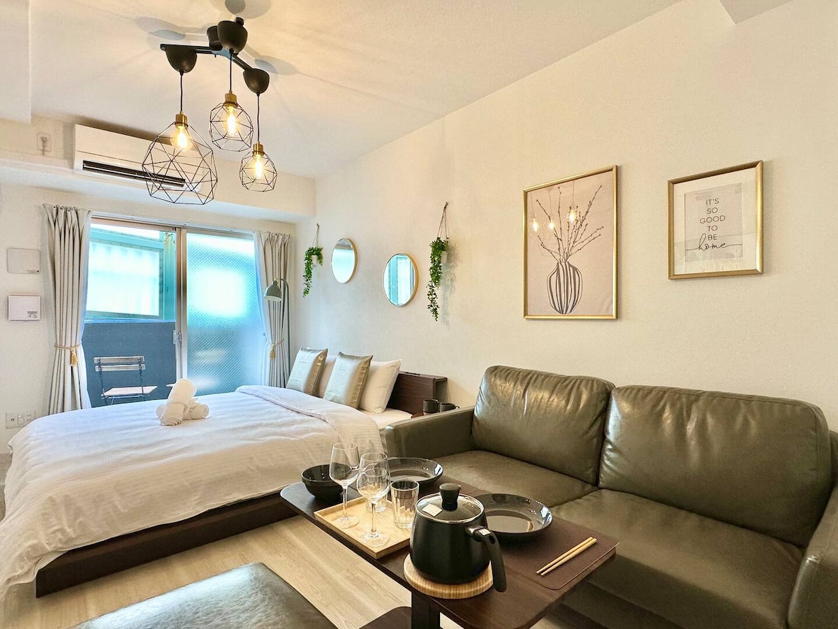 5 min gājiena attālumā no stacijas/2 bezmaksas velosipēdi/Namba 10 min/pirmās nepieciešamības preču veikals 1 min gājiena attālumā/55' TV/ērts dīvāns