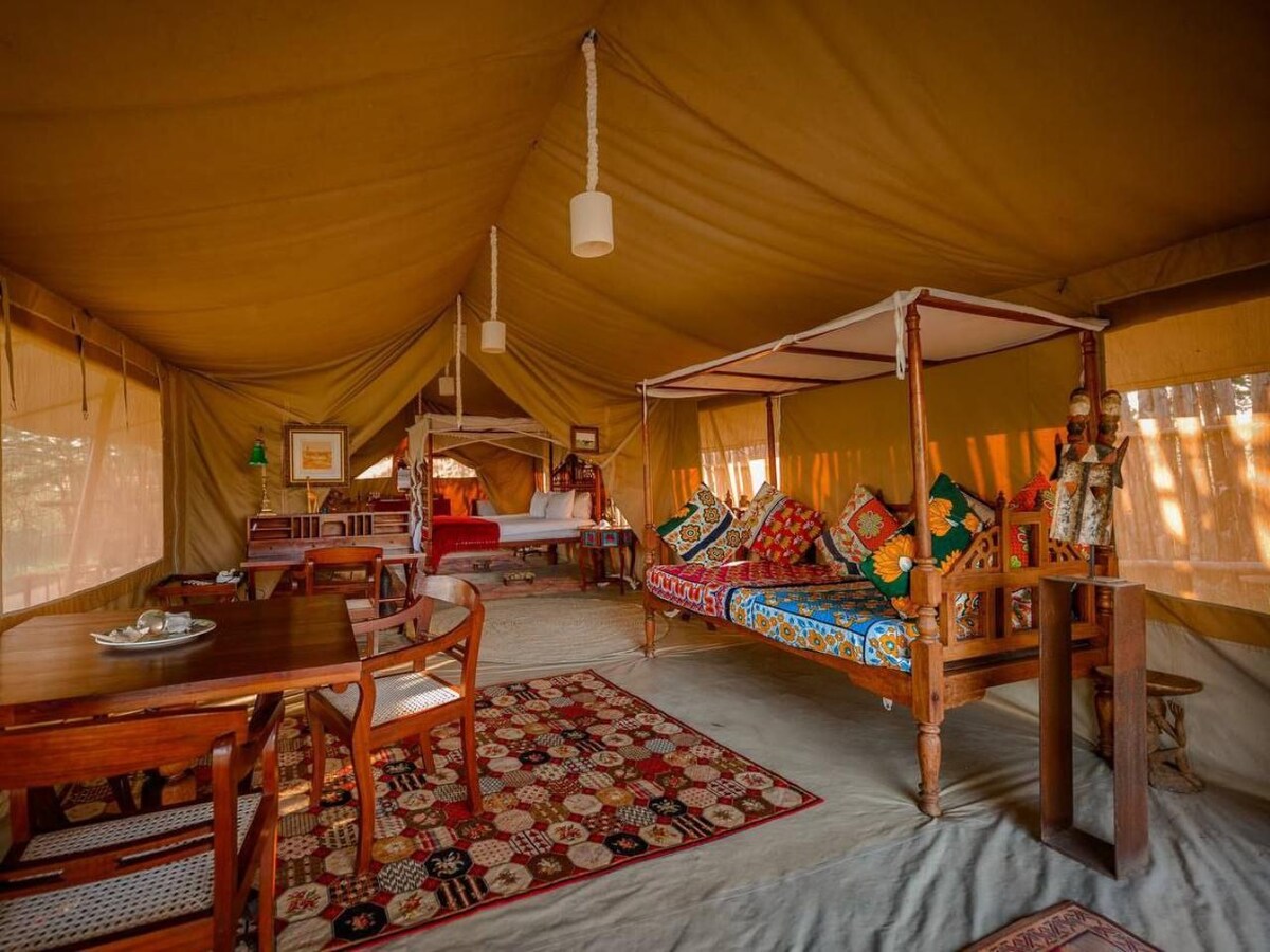 The spacious bedroom is furnished with a double and single beds, and has a shower en-suite. The tent has a seating area and library, with a large terrace, and a private outdoor fire pit.