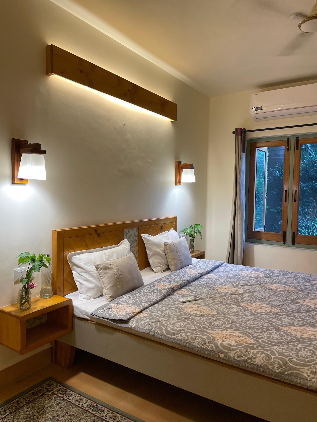Punjab Village Farm: This independent cottage is located within a beautiful farm stay, just a 90-minute drive from Amritsar city. Nestled in the picturesque countryside, the property offers an authentic experience of rural Punjab. It provides a tranquil escape from the noise of busy cities and crowded tourist spots. The cottage is designed in a traditional mud house style and features well-furnished interiors with high-quality furniture, colonial-style lighting, and modern bathroom fixtures.