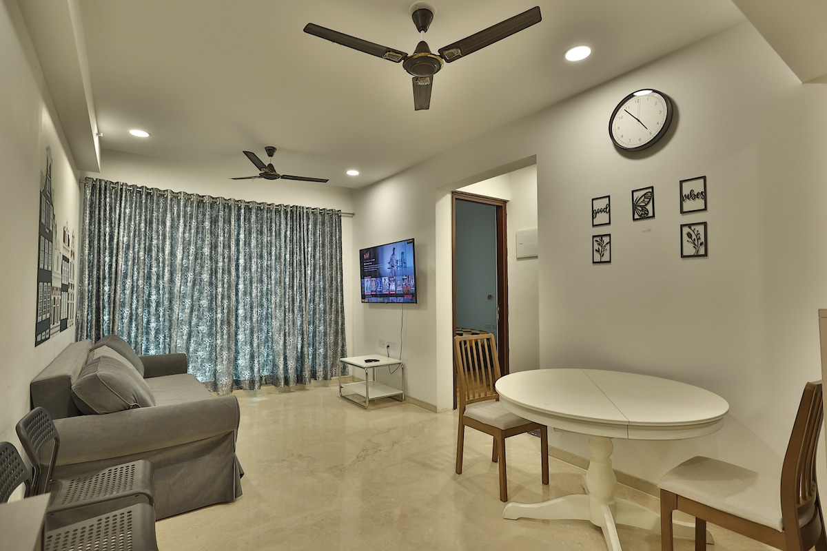 Madhuleela by Innjoyful: 600 sq ft., big size 1-bed accommodation. Here, we have 4 apartments in the same building. Your comfort zone with a fully equipped kitchen with amenities like a washing machine, microwave oven, and a gas connection in a modular kitchen. Enjoy exclusive privacy in this 1st-floor apartment—the only apt on the entire floor. Sensory Garden: 50m Juinagar Station (W): 350 m Sanpada Station 1.7 km Mindspace Juinagar: 2.6 km Vashi Station: 3 km DY Patil Stadium: 3.9 km
