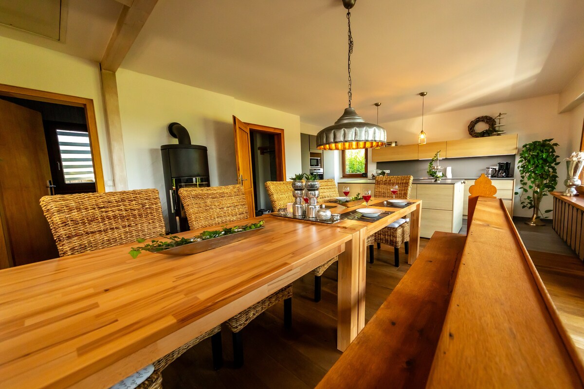 Laipni lūdzam Heaven Homes in Bad Driburg! ***Atpūtieties ar fantastiskiem skatiem tieši pie meža*** Apsēdieties un izbaudiet uzturēšanos savā grezni stilīgi iekārtotajā brīvdienu mājā tieši pie meža. Sāciet dienu ar svaigi pagatavotu kafiju no pilnībā automātiskā automāta vai kādas no daudzajām tējām, baudot skatu pār ieleju vai dodoties rīta pastaigā ar ToGo pa brīnišķīgajiem Egžu kalniem.