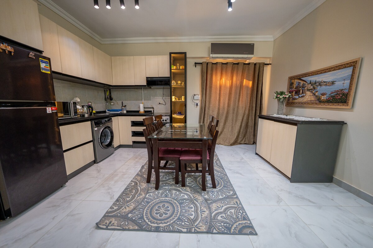 Iepazīstiet Jauno Kairu no 5. apmetnes sirds šajā stilīgajā, ģimenēm piemērotajā 3 guļamistabu dzīvoklī. Ar divguļamo gultu, divguļamo gultu, vienguļamo gultu, dīvāngultu un mazuļu gultiņu tas ir ideāli piemērots ģimenēm, grupām vai ilgtermiņa rezervācijām. Izbaudiet pilnu gaisa kondicionētāju, ātru Wi-Fi, Netflix, Shahid VIP un YouTube. Atpūtieties uz privāta balkona ar skatu uz klusu dārzu Jūs atradīsieties tikai dažu minūšu attālumā no Kairas festivāla pilsētas, 5A, The Drive, U Venues, 90th Street, EIEC un populārākajām slimnīcām ⚠️Piezīme: villā nav lifta.